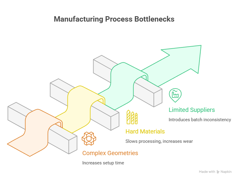 What makes this challenging is how small design choices ripple across the system. A slightly tighter tolerance increases machining time. Increased machining time reduces throughput. Reduced throughput extends lead time. Longer lead times push teams toward expediting and higher inventory.